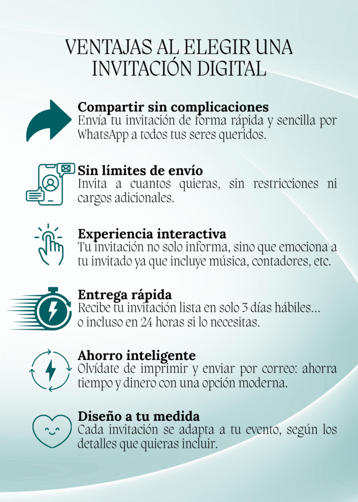 Diseñamos invitaciones que se adaptan al estilo y gusto de cada cliente. Nos especializamos en crear productos digitales únicos con música, imágenes y palabras que reflejan tu historia para que compartas la alegría de tu celebración con quienes más amas de una manera original y creativa.